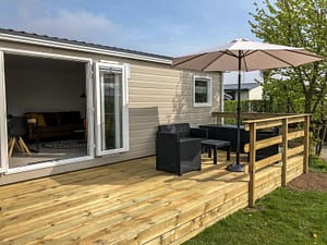 "Golf View", 3-kamers mobilhome op de begane grond. Ruim en licht, modern en smaakvol ingericht: open woon-/eetkamer met eettafel en TV (Flatscreen TV), elektrische kachel....