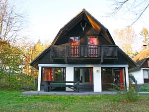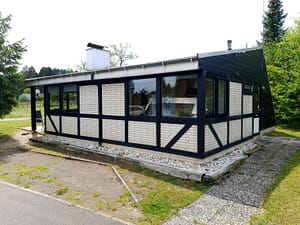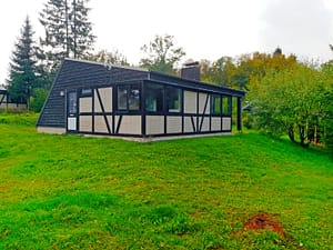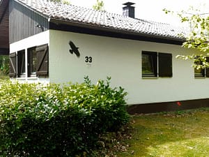 "Haus 42", bungalow 4-kamers 60 m2. Gedeeltelijk afgeschuinde daken, gezellig ingericht: woon-/eetkamer 30 m2 met open haard en Sat-TV (Flatscreen TV). Uitgang naar het terras. 1...