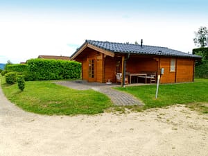 "Holzchalet E", bungalow 3-kamers 52 m2. Gezellig ingericht: woon-/eetkamer 28 m2 met Sat-TV (Flatscreen TV). Uitgang naar het terras. 1 kamer 6 m2 met 1 2-pers bed (160 cm,...