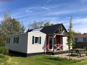 "Gardenia", 4-kamers mobilhome 34 m2. Zeer mooi en smaakvol ingericht: woon-/eetkamer met 1 2-pers divanbed (140 cm, lengte 190 cm), Sat-TV en air-conditioning. Uitgang naar het...