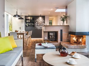 "Cottage Premium Nouveau Design", huis 5-kamers 96 m2. Licht, gerenoveerd, comfortabel en mooi ingericht: woon-/eetkamer met open haard, eettafel en TV. Uitgang naar het terras....
