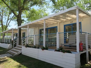 "Vivaldi (CAO121)", 3-kamers mobilhome 34 m2. Doelmatig en modern ingericht: woon-/slaapkamer met 1 divanbed en eettafel. 1 kamer met 1 2-pers bed (160 cm), douche/WC. Uitgang...