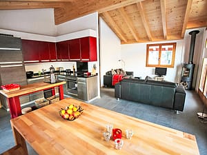 "Le Chamois Vert", chalet 5-kamers 110 m2 op 3 verdiepingen. Comfortabel en mooi ingericht: hal. Woon-/eetkamer met Kabel-TV en radio. Uitgang naar het terras. Groot, open keuken...