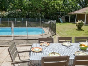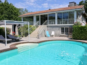 Villa 5-kamers 112 m2 op 2 verdiepingen, op het zuidwesten gelegen. Comfortabel ingericht: woon-/eetkamer 33 m2 met TV. Uitgang naar het zwembad. 1 kamer 11 m2 met 1 2-pers bed...