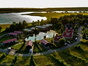 Een combinatie met een groeps lodge en 4 comfortabel vierpersoons lodges. De lodges hebben een grote schuifpui direct naar het vlonderterras met uitzicht op de grote vijver. De...