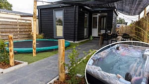 Bubbelbad en grote trampoline bij comfortabel 6p chalet op vakantiepark Dit zeer comfortabele zespersoons chalet, met buiten een vijfpersoons Wellness Spa met 42 massage jets...
