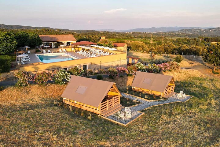 Deze kindvriendelijke agriturismo met appartementen en glamping tenten is gelegen in de groene heuvels rondom Riparbella. Een plek met een panoramisch uitzicht op het  glooiende landschap en de Toscaanse kust op de achtergrond.