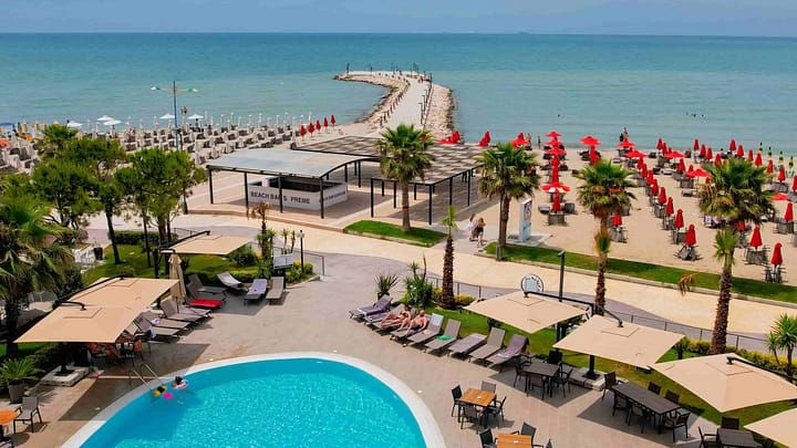 6, 8, 11 of 15 dagen relaxen in Albanië in een 5*-hotel direct aan het strand in Golem incl. vlucht, transfer en ontbijt of all-inclusive Met zijn fantastische strand, adembenemende uitzichten op zee, uitmuntende architectuur, stijlvolle, comfortabele accommodatie en vijfsterren voorzieningen is Supreme Hotel de perfecte plek voor een luxe vakantie. Het hotel ligt direct aan het privéstrand in Qerret, Kavajë en biedt daarnaast een heerlijk buitenzwembad. Ontdek een culinair paradijs in het restaurant, waar verrukkelijke smaken en adembenemende vergezichten samenkomen. Bereid je voor op een onvergetelijke zonvakantie in het betoverende Golem in Albanië! Ontsnap aan de drukte van het dagelijks leven en laat je verwennen met luxe en comfort in het prachtige 5-sterren Supreme Hotel. Wakker worden met de zon op je gezicht en het geluid van de golven op de achtergrond, terwijl je geniet van een heerlijk ontbijt met uitzicht op de glinsterende Adriatische Zee. Breng je dagen door op de ongerepte zandstranden van Golem, waar je kunt ontspannen onder de warme zon, zwemmen in het kristalheldere water en genieten van spannende watersporten. Verken de prachtige omgeving met excursies naar nabijgelegen steden, historische bezienswaardigheden en adembenemende natuurlijke landschappen.