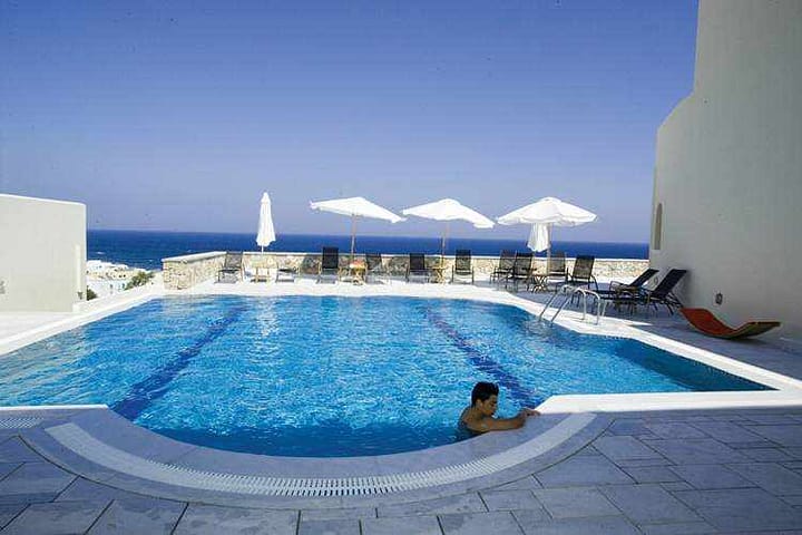 Het hotel bevindt zich aan de voet van de bergen waar ook het antieke Thira was gelegen. Een van de bekendste stranden van Santorini, Kamari, ligt op loopafstand van het hotel.