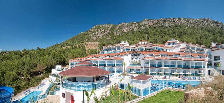 Het hotel ligt op een heuvel waardoor je vanuit delen van het complex een schitterend panoramisch uitzicht hebt over de omgeving en de zee, terwijl het openbare strand en het centrum van Ölüdeniz met winkels, cafés en restaurants op korte afstand zijn.