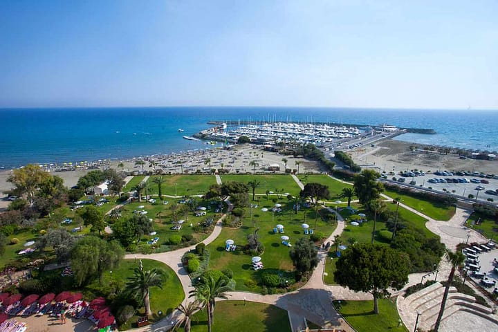 Dit luxehotel ligt direct aan het strand, aan het eind van de kustweg en in de buurt van de Amathus opgravingen. Winkelmogelijkheden, restaurants en bars/pubs bevinden zich op ca. 500 m afstand. Limasol ligt op ca. 15 km afstand. Direct voor het hotel is een bushalte waar de bus naar Limasol stopt. De dichtstbijzijnde discotheek ligt op 11 km afstand.