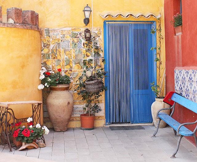 Vlakbij Trapani, in de binnenlanden, vond ik de warme sferen van de agriturismo van de familie Curatolo. En al snel had ik door: deze azienda is een lust voor mijn oog. De terracottakleurige en gele muren, de felblauwe luiken, de bloeiende tuin en al die snuisterijen dankzij de eeuwenoude familietradities. Zonet liet Toto me foto’s zien van hoe ze vroeger op de binnenplaats aten. En nog steeds wonen moeder, broer en zus hier. ‘We willen alle zintuigen stimuleren,’ zegt Toto als we samen verder lopen naar de grote tuin, via het kapelletje, langs het zwembad, richting de appartementen. ‘Vroeger waren dit de veestallen. En nu mag jij hier slapen,’ lacht hij. In de schaduw van de boom tref ik diezelfde warme en traditionele stijl, maar ik mag alleen mijn tas neerzetten, want ‘er is nog zoveel meer.’ Toto neemt me mee naar de kippen, de pauwen en de rest van de dieren. En naar nog zo’n perfecte plek voor kinderen: de speeltuin. Ik glimlach: wat ruik ik daar?