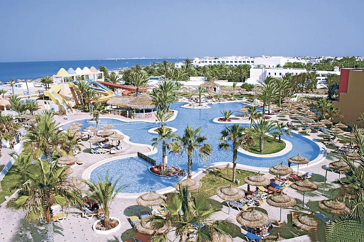 Caribbean World Thalasso Djerba is een 4-sterrenhotel in de stad Midoun. Dit mooie hotel ligt direct aan het zandstrand en biedt alles voor een leuke vakantie met het hele gezin. Terwijl de kinderen aan het spelen zijn in de kidsclub kan jij jezelf verwennen in het wellnesscenter. Maar als je liever samen tijd doorbrengt met de kinderen, roetsj dan met z'n allen van één van de 5 glijbanen, speel een potje minigolf en geniet in de avond van een leuke show. Toch liever wat ontspannen maar wel de kinderen in de gaten willen houden? Ga dan relaxen op een ligbedje rondom het zwembad. Dankzij de all inclusive formule hoeft niemand ergens aan te denken en kan je de hele dag snacks eten. Klinkt dat niet als een echte vakantie!